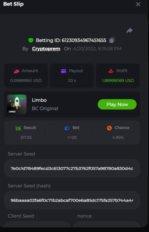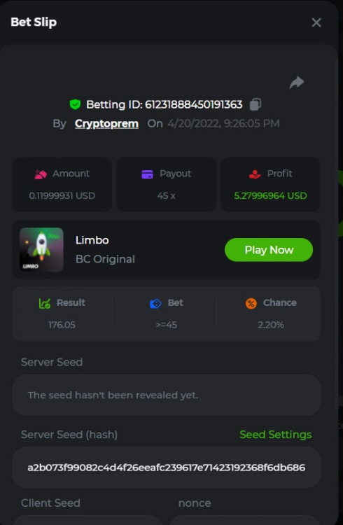 13. Betting ID: 1719831209635249024 Aloha king elvis 102.80x Betting ID: 1719854577341462535 Candy Monsta 134.25x