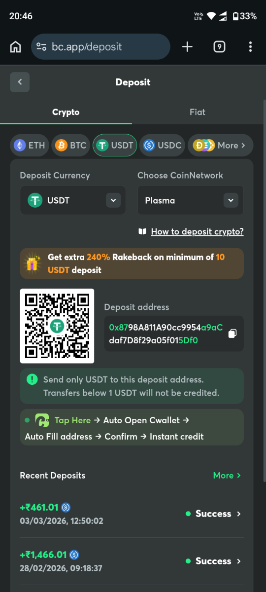 Warrior777 Posted 6 hours ago Share Posted 6 hours ago Hi Team, I had deposited USDT on Plasma network in bc.game but it was not credited. Time: 2026-03-09 20:23:59 Receiving: 55.233757 USDT Network fee: 0.1 USDT Network: Plasma (USDTO) Withdrawal address: 0x8798A811A90cc9954a9aCdaf7D8f29a05f015Df0 TXID: 0xa64f23d0b8544cb77a88211d2904c43457e5129c660f701d88582a97926f4c70 Plasma network - https://plasmascan.to/tx/0xa64f23d0b8544cb77a88211d2904c43457e5129c660f701d88582a97926f4c70 I have contacted the bc.game live support but they keep asking for order id but it was not generated. I request the team to please look into the issue, the attached screenshot and plasma network and credit the USDT to my account. My userid is 1046452 Warrior777 Regards Link to comment Share on other sites More sharing options...